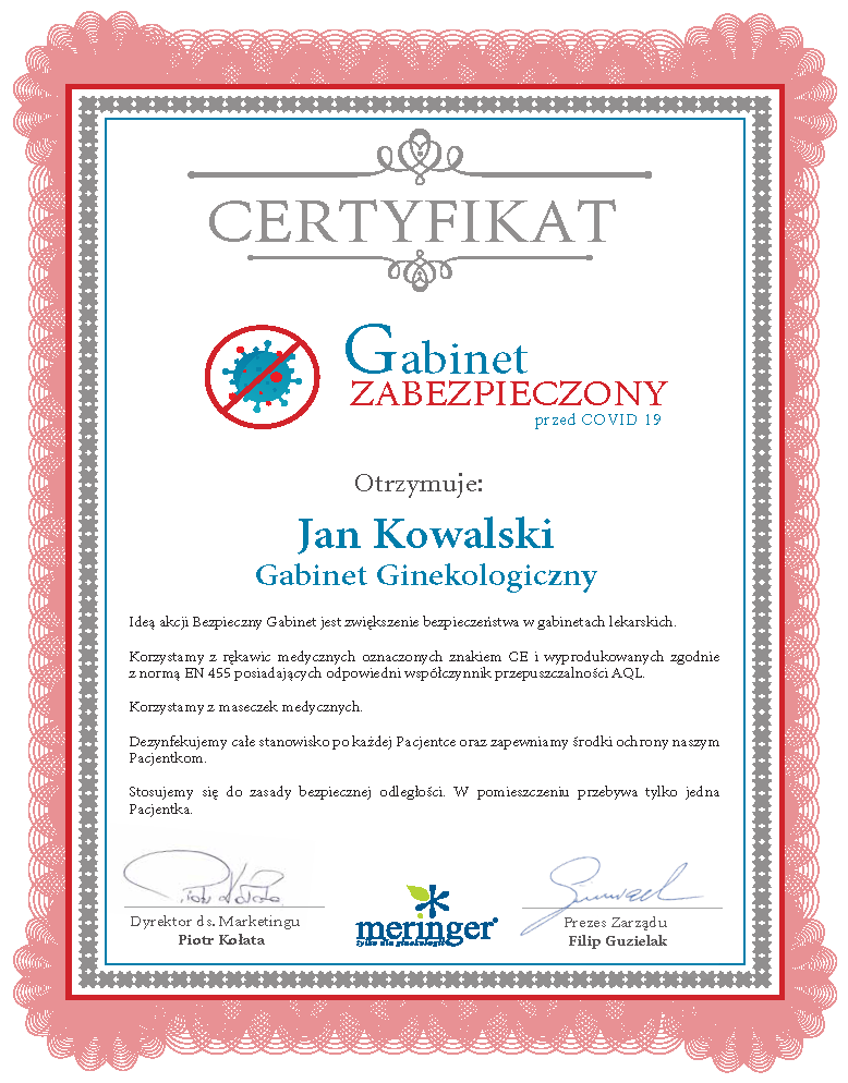 Z myślą o Pacjentkach takich jak Ty stworzyliśmy Certyfikat Gabinetu Zabezpieczonego przed COVID Certyfikat to pisemne poświadczenie troski o dobro Pacjenta, potwierdzenie deklarowanych działań minimalizujących ryzyko zarażenia się wirusem. Przyznawany jest Lekarzom, którzy stawiający dobro Pacjenta na pierwszym miejscu.
